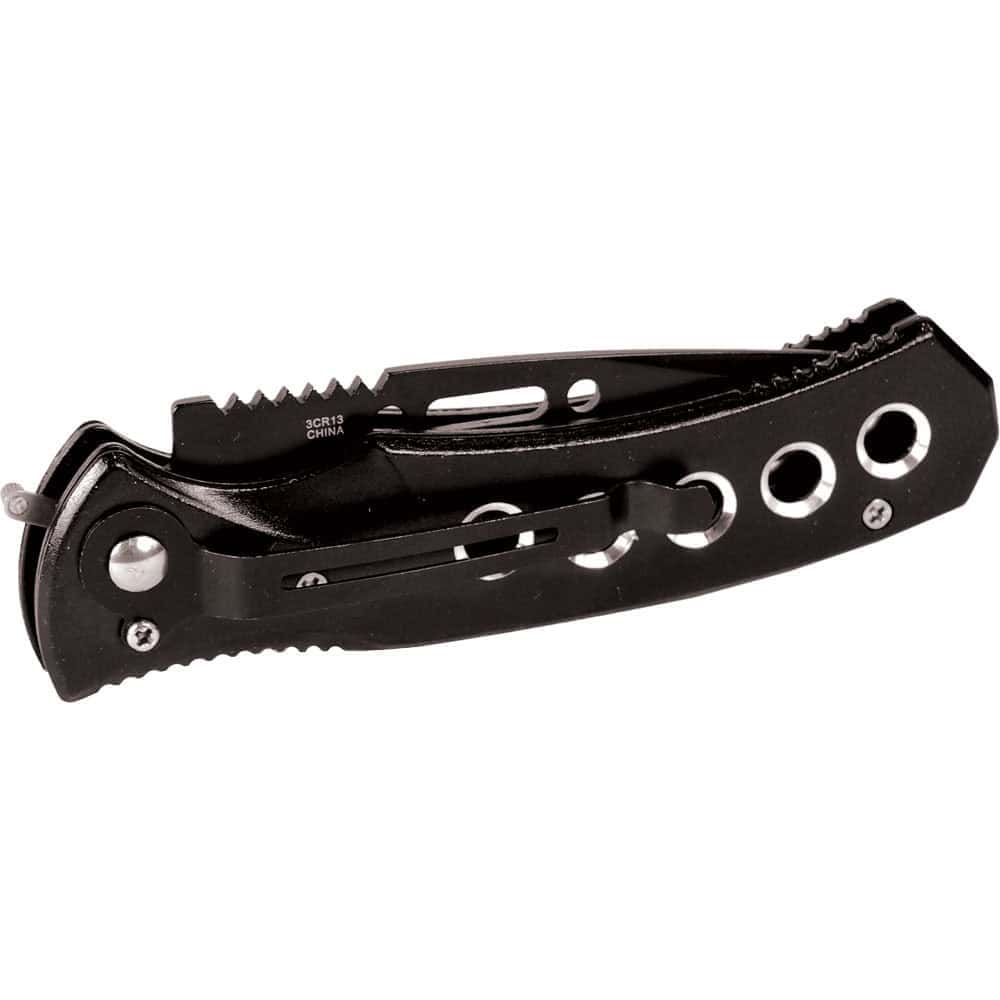 Overall length is 8 inches open, 4.5 inches closed. Blade is 3.5 inches, stainless steel with black finish. Handle is stainless steel with 5-hole design. Weighs 0.4 lbs. Dimensions: 8″ x 1.38″. No batteries needed. Check your local laws regarding automatic knives before purchasing — regulations vary by state and locality.