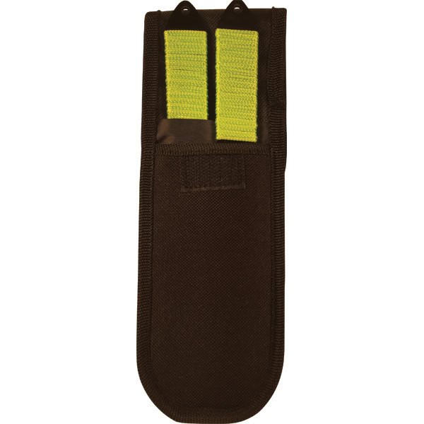 It’s a carry pouch — more of a storage sleeve that holds both knives together for transport. It’s not designed for belt or hip carry. If you want to carry them on your person at the range, you’d need a separate belt sheath. For getting them from your bag to the throwing line, the included pouch does the job.